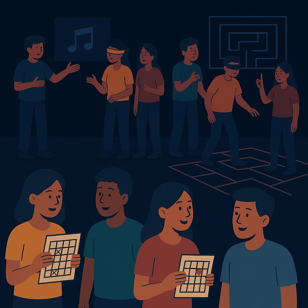 Part A – Sync & Solve (10 mins): One member views the full system for 30 seconds and verbally conveys its logic (no gestures/sketches) to their partner, who solves a non-electrical jigsaw resembling the system. Scoring: Jigsaw Completion – 15 points; Speed Bonus – 10 points (1st), 5 points (others). Part B – Path Decoder (10 mins): After solving the puzzle, teams receive three translucent cards with partial paths. Correct stacking reveals one true path to their circuit. Scoring: Correct Path – 20 points; Penalty – -5 per wrong attempt.